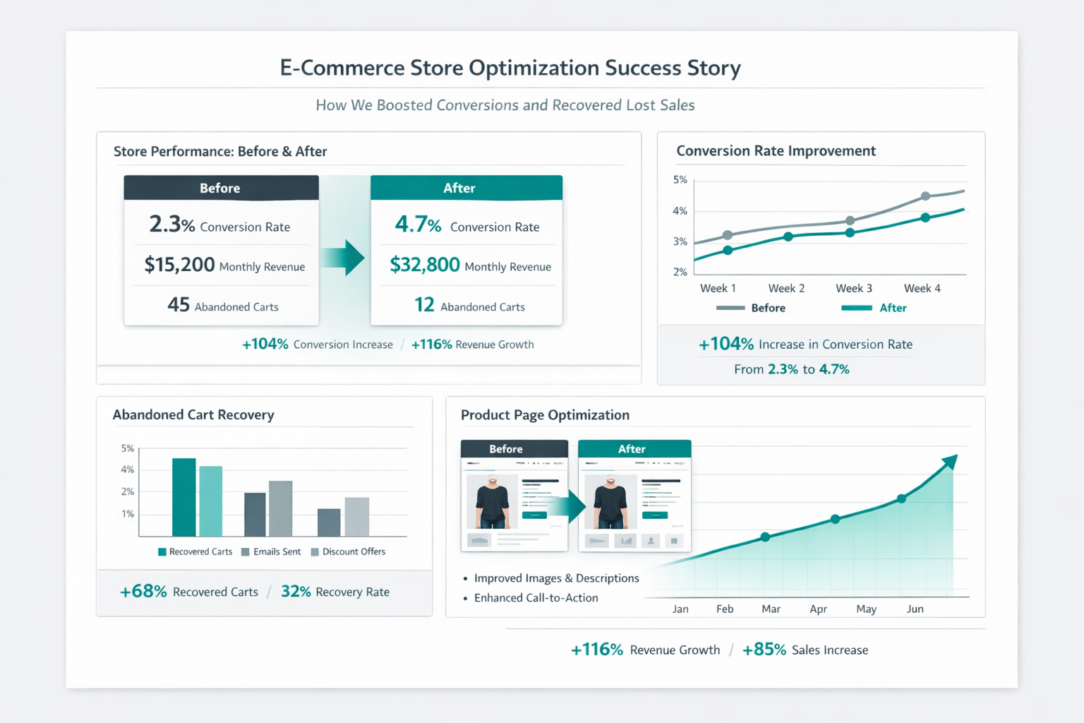 We optimize product pages, checkout flow, and user experience to maximize revenue.
